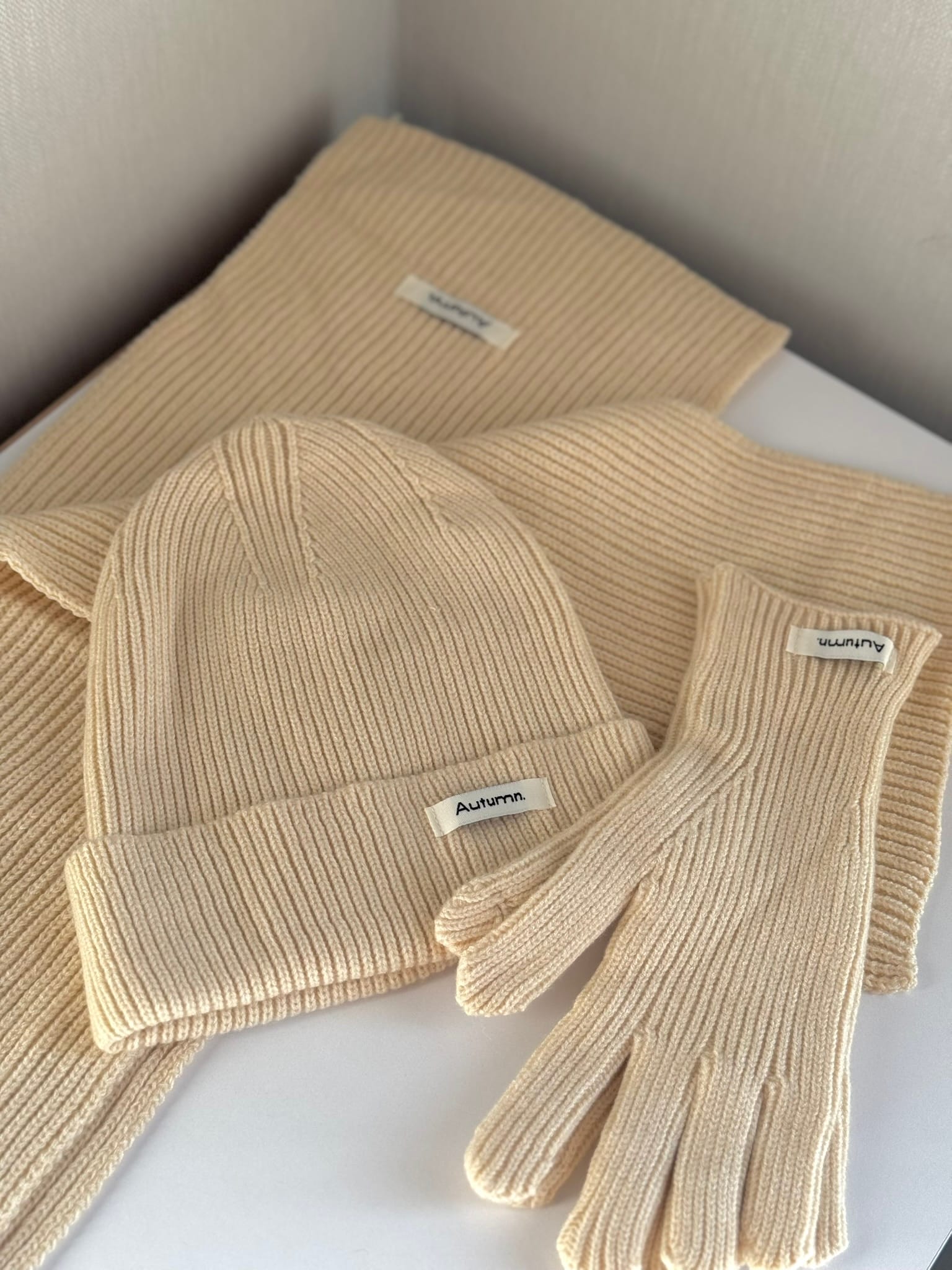 Теплий зимовий набір жіночий 3 в 1: шапка, шарф та рукавички із кашеміру у світло-бежевому кольорі